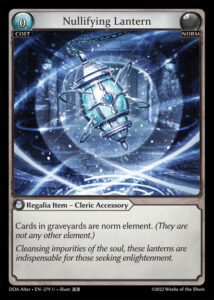 ほとんどのマッチアップではNicoは使用されませんが、第1ゲームがSuzaku, Vermillion PhoenixやFire Diao Chanのような非戦闘ダメージをメインとするデッキだった場合、メインデッキにNicoを投入すると、非常に有利になります。通常、NicoとNullifying lanternCenser of Restful PeaceTariff Ringのいずれかを、サイドボードの2枚と置き換えます。Nullifying lanternは攻撃的なFire 属性デッキや墓地依存のWater属性コンボデッキ対策として残します。Censer of Restful PeaceはFloating Memoryを多用するデッキに有効で、Tariff Ringは通常、Allieデッキや防御カードを手札に抱えられないほどテンポプレイを必要とされるデッキへの対策になります。