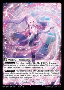 プレイのコツMerlin Memorite VassalのInherited Effect能力によって付与されるSheenカウンターの配置先は相手が選べるため、相手のAllyを先に倒しておくことで、ChampionにSheenカウンターを置かせやすくなります。これはいわゆるスパイクターンの準備として有効です。